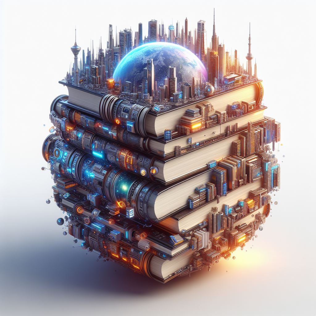 A stack of books with a futuristic cityscape and a globe built on top, with glowing lights and intricate details.