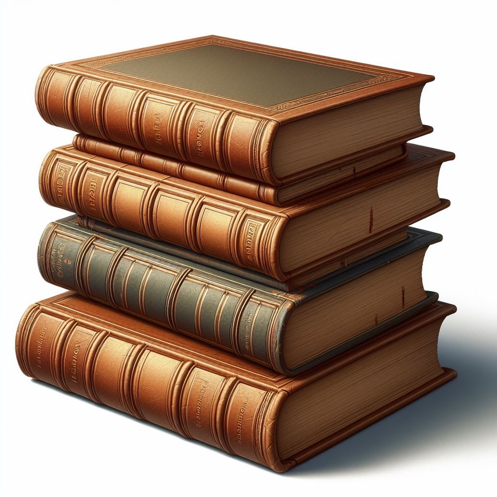 A stack of four vintage, leather-bound books sits on a white background, their spines showing intricate details and worn edges.