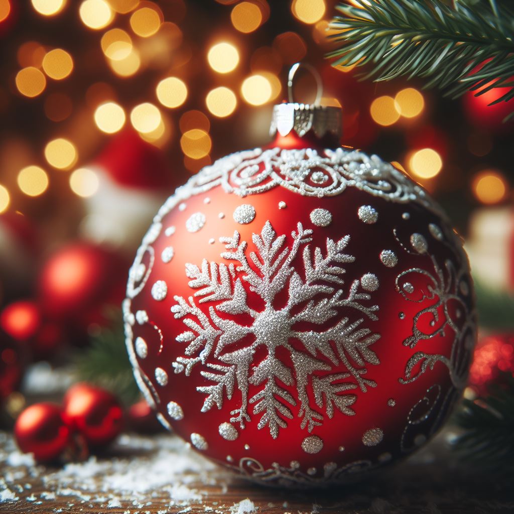 A red Christmas ornament with a snowflake design sits in front of a blurred background of twinkling lights.