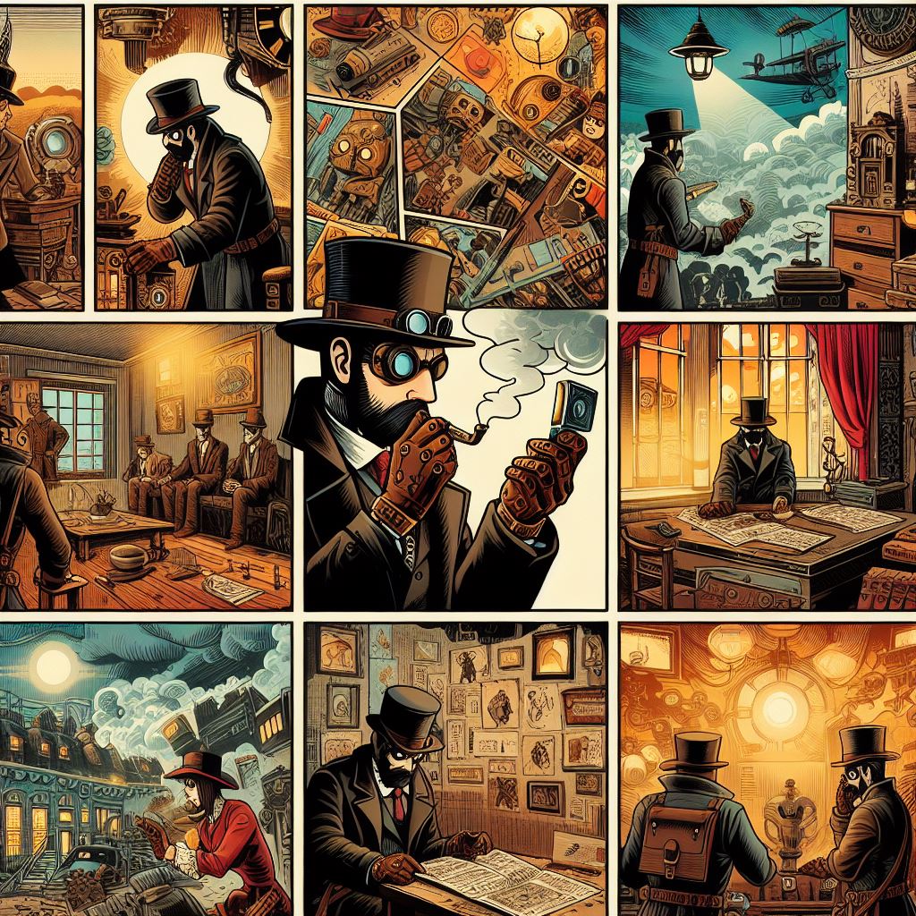A steampunk detective with goggles and a pipe, investigates a mysterious case in a bustling cityscape.