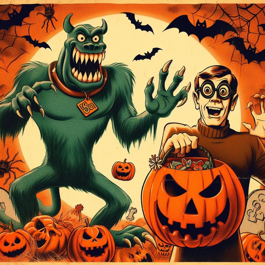 art, artwork, boy, candy, celebration, character, costume, design, fun, graphic, halloween, holiday, illustration, monster, night, pumpkins, retro, scary, spooky, vintage