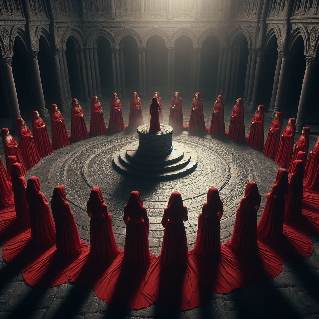ceiling, ceremony, circle, cult, dark, figures, gathering, gothic, hall, light, mystery, occult, platform, red, religious, ritual, robes, stone, vaulted, women
