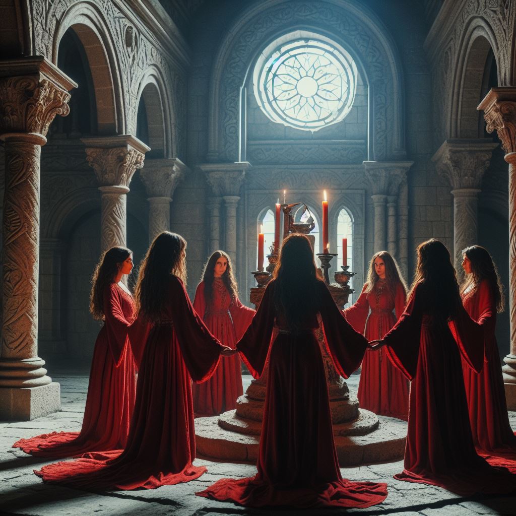 A group of women dressed in red robes perform a ritual in a dimly lit room. They stand in a circle around an altar with candles.