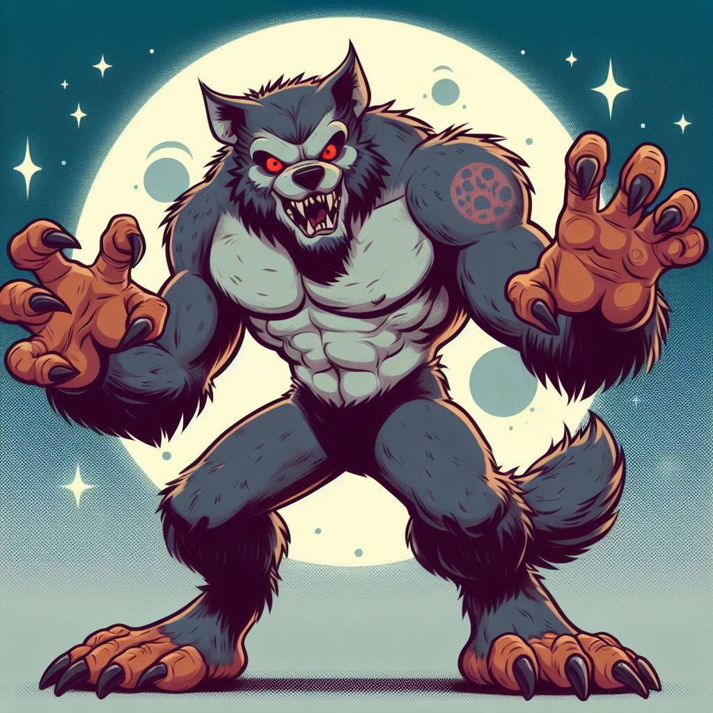 A werewolf snarls and bares its teeth under a full moon, its claws extended.