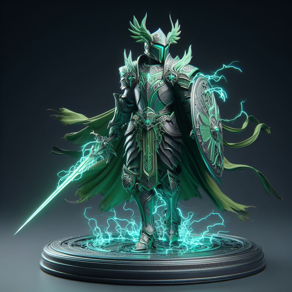 armor, artwork, background, dark, epic, fantasy, figurine, glowing, green, hero, knight, lightning, magic, medieval, power, sculpture, shield, statue, sword, warrior