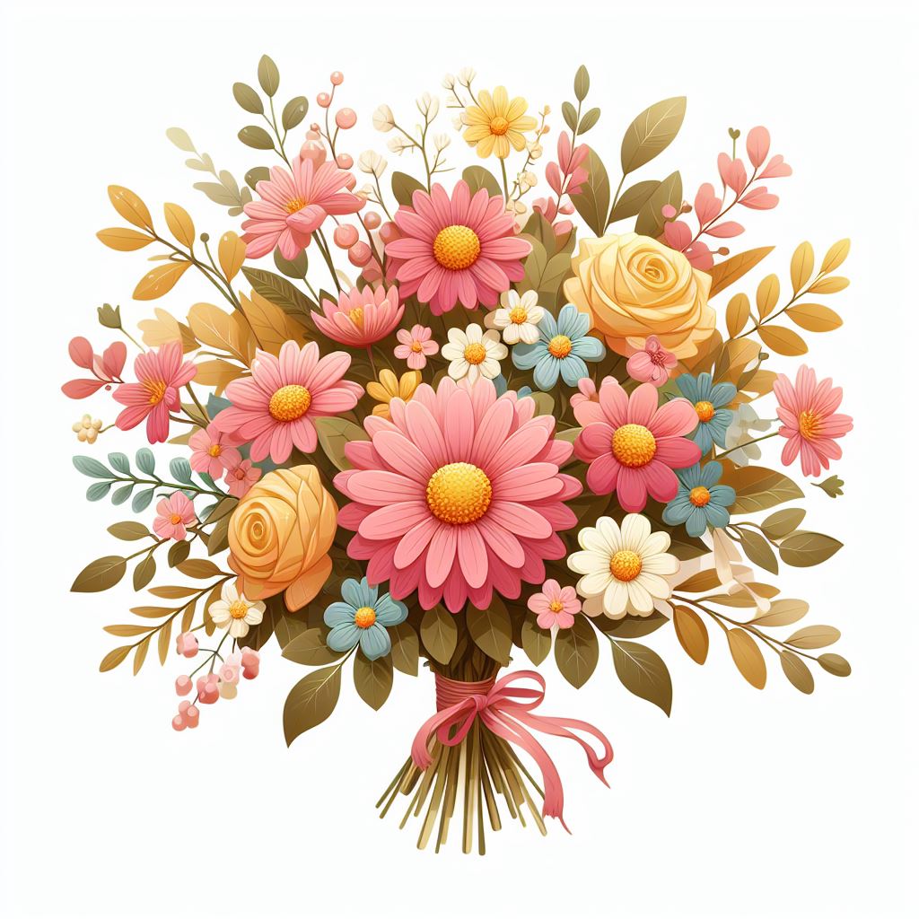 arrangement, art, beautiful, bouquet, colorful, design, floral, flowers, graphic, green, illustration, leaves, nature, pink, ribbon, spring, summer, vibrant, white, yellow