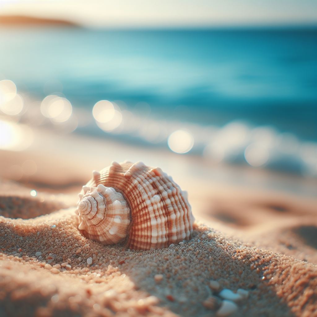 A seashell rests on the sand near the ocean shore, bathed in the warm light of the setting sun.