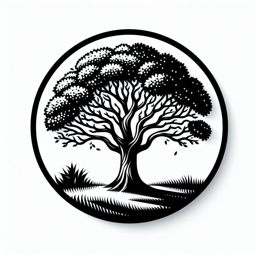 A black and white illustration of a tree in a circular frame. The tree is detailed and has a thick trunk.