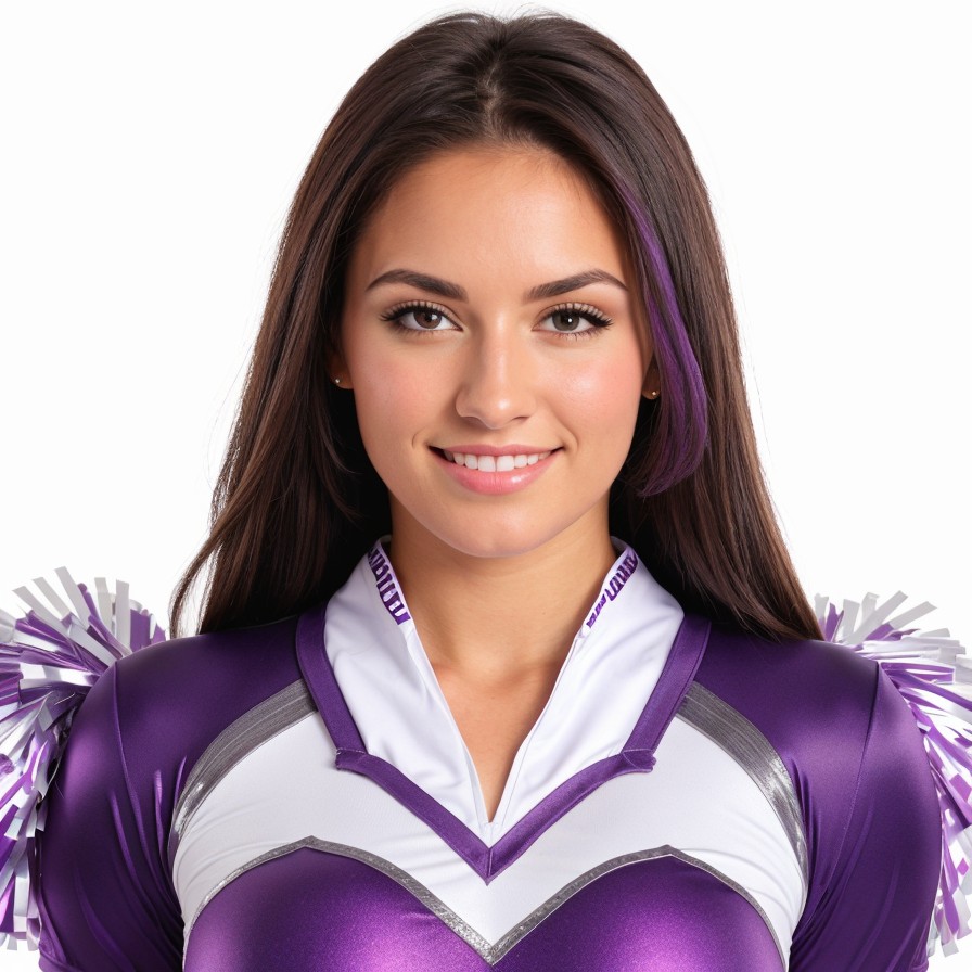 A young woman with long brown hair and a purple streak smiles while wearing a purple and white cheerleading uniform with pom-poms.