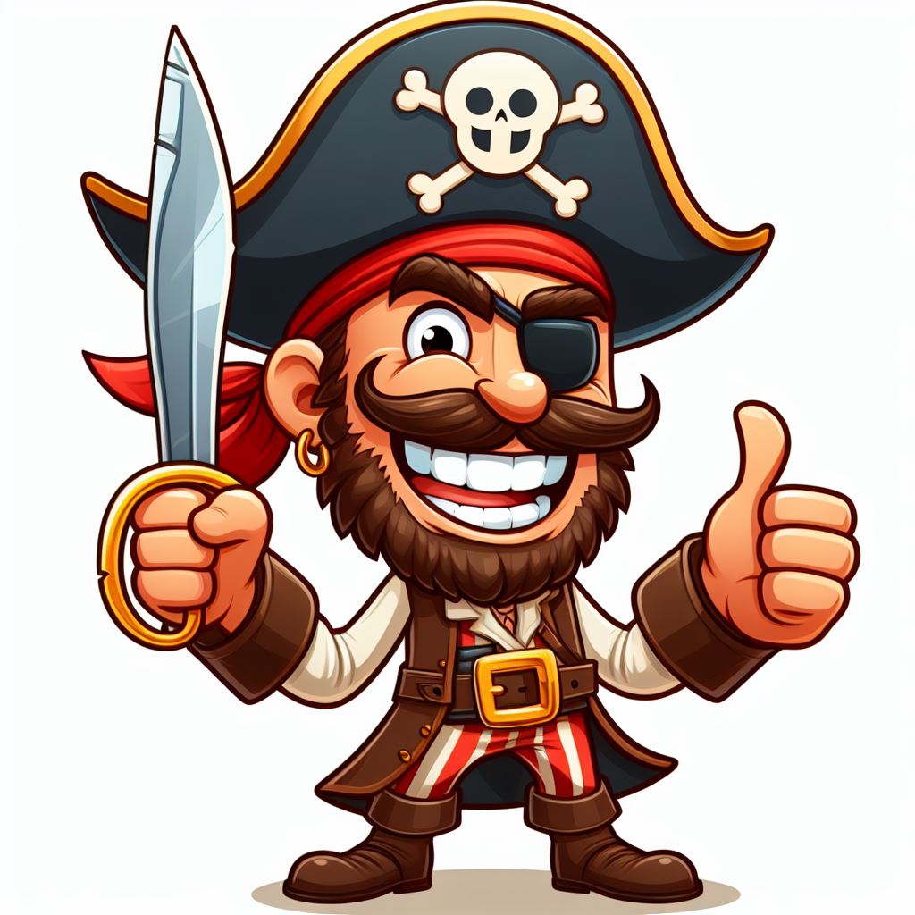 A cartoon pirate holds a sword in one hand and gives a thumbs up with the other. He is smiling and has an eyepatch.