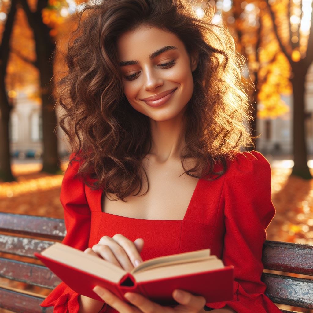A woman in a red dress sits on a park bench, smiling as she reads a book, surrounded by fallen autumn leaves.