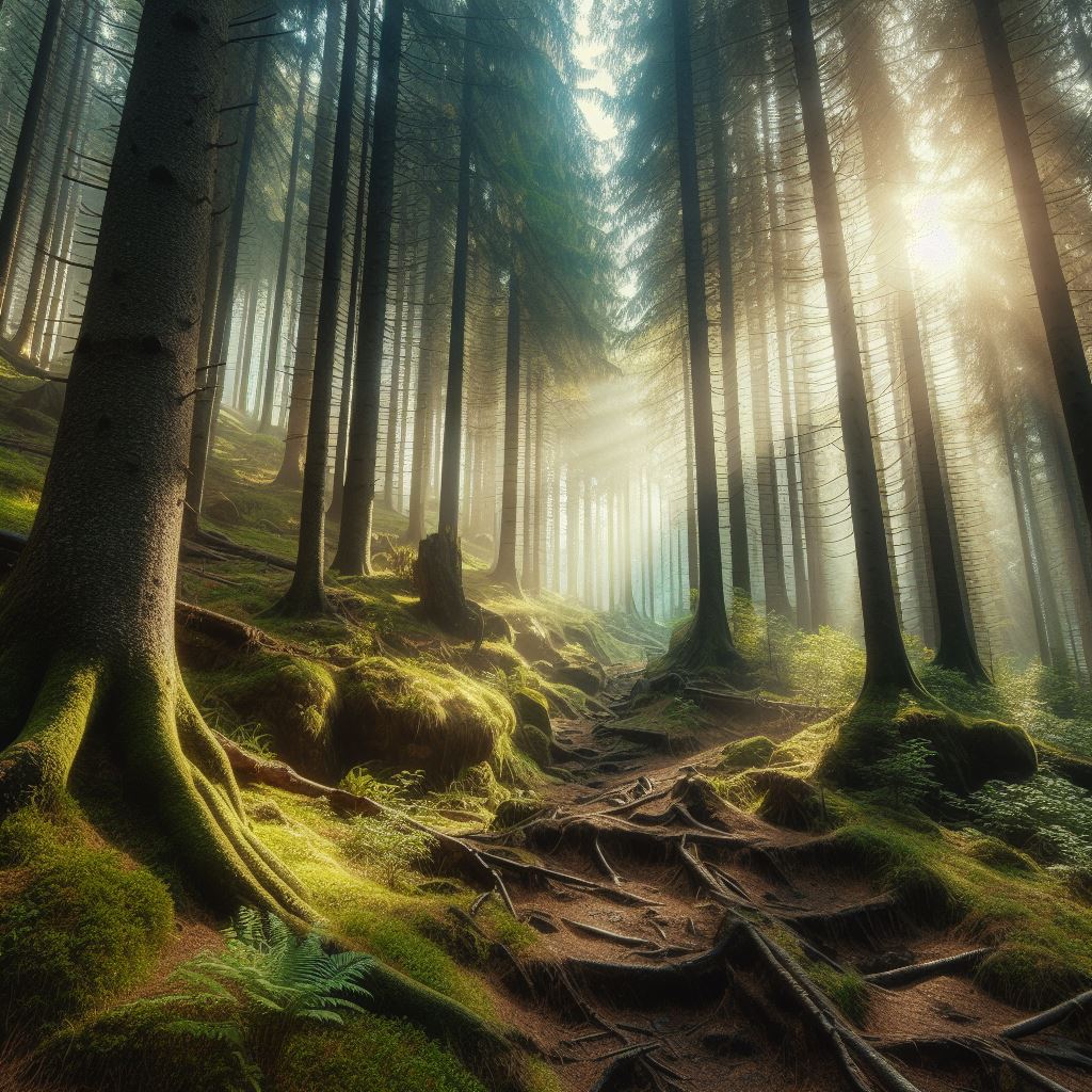 A sunbeam shines through a dense forest, illuminating a path lined with moss and tree roots.