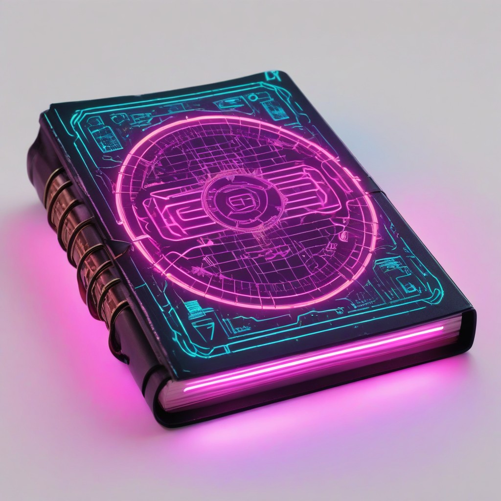 A black book with a glowing futuristic design on the cover that features a circular pattern and pink illuminated edges.