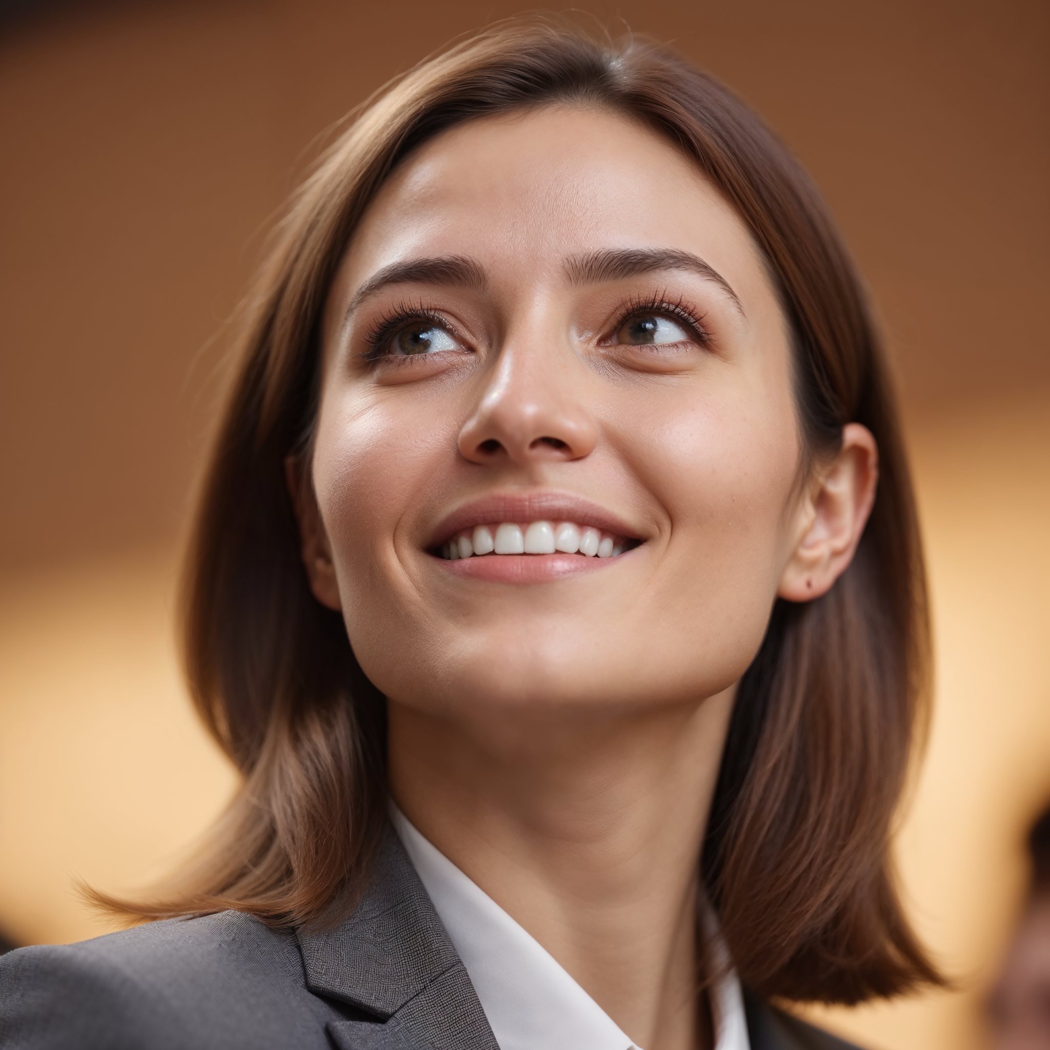 A businesswoman in a gray suit looks upwards and smiles.