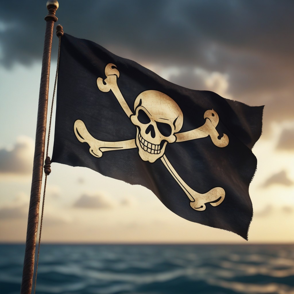 A black pirate flag with a skull and crossbones flies on a ship at sea. The sun is setting, casting a warm light on the scene.