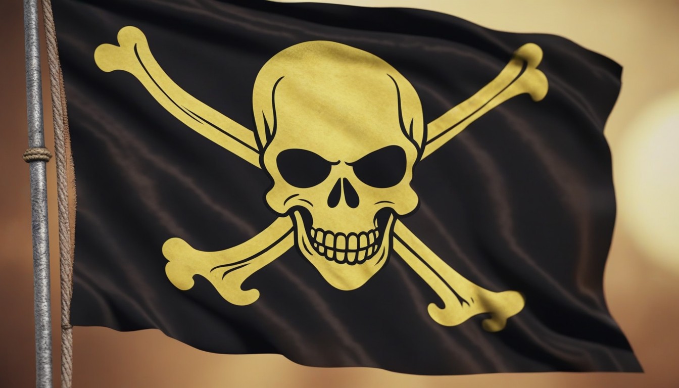 A black pirate flag with a yellow skull and crossbones design is flying in the wind.