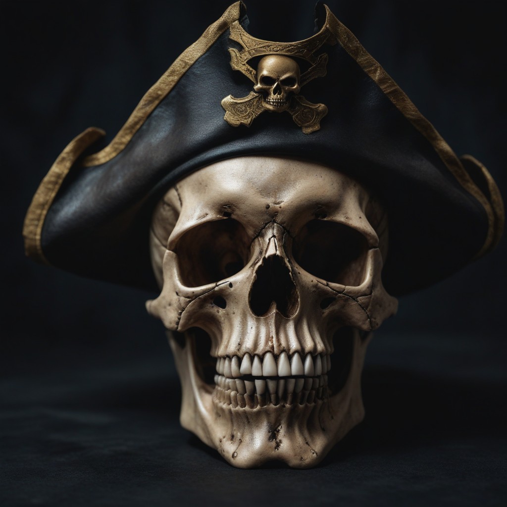 A human skull wearing a black pirate hat with a skull and crossbones emblem.
