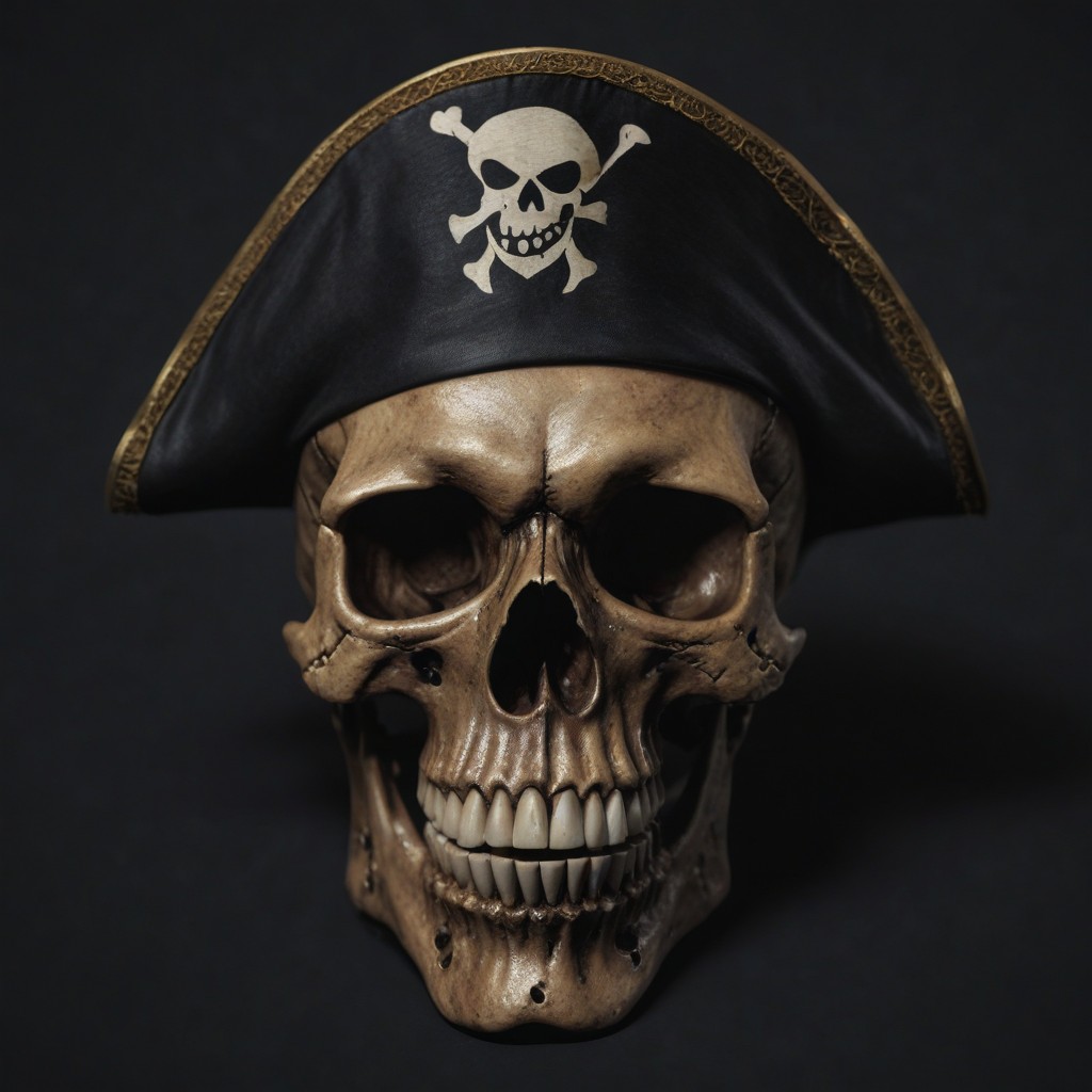A human skull wearing a black pirate hat with a white skull and crossbones design.