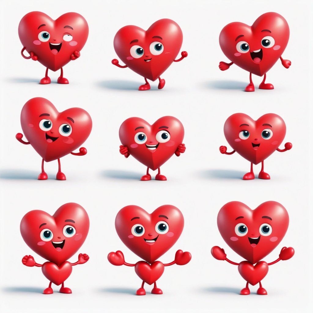 Nine red heart characters with cartoon faces and limbs are posed in different ways.