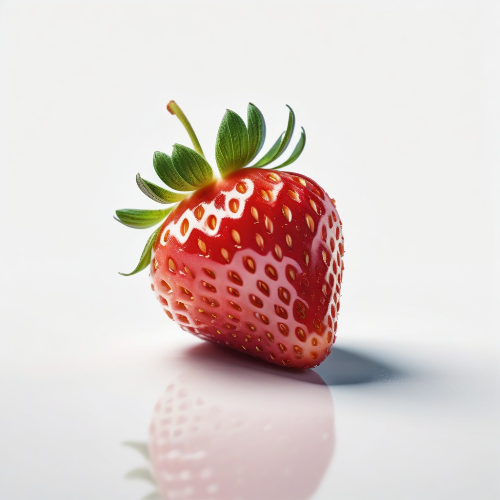 A single, ripe strawberry sits on a white surface, its red skin glistening under the light.