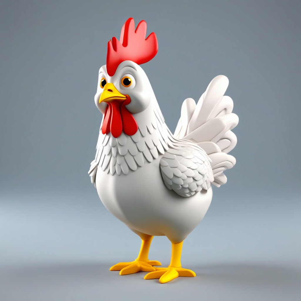 A 3D cartoon chicken with a red comb stands on a gray background.