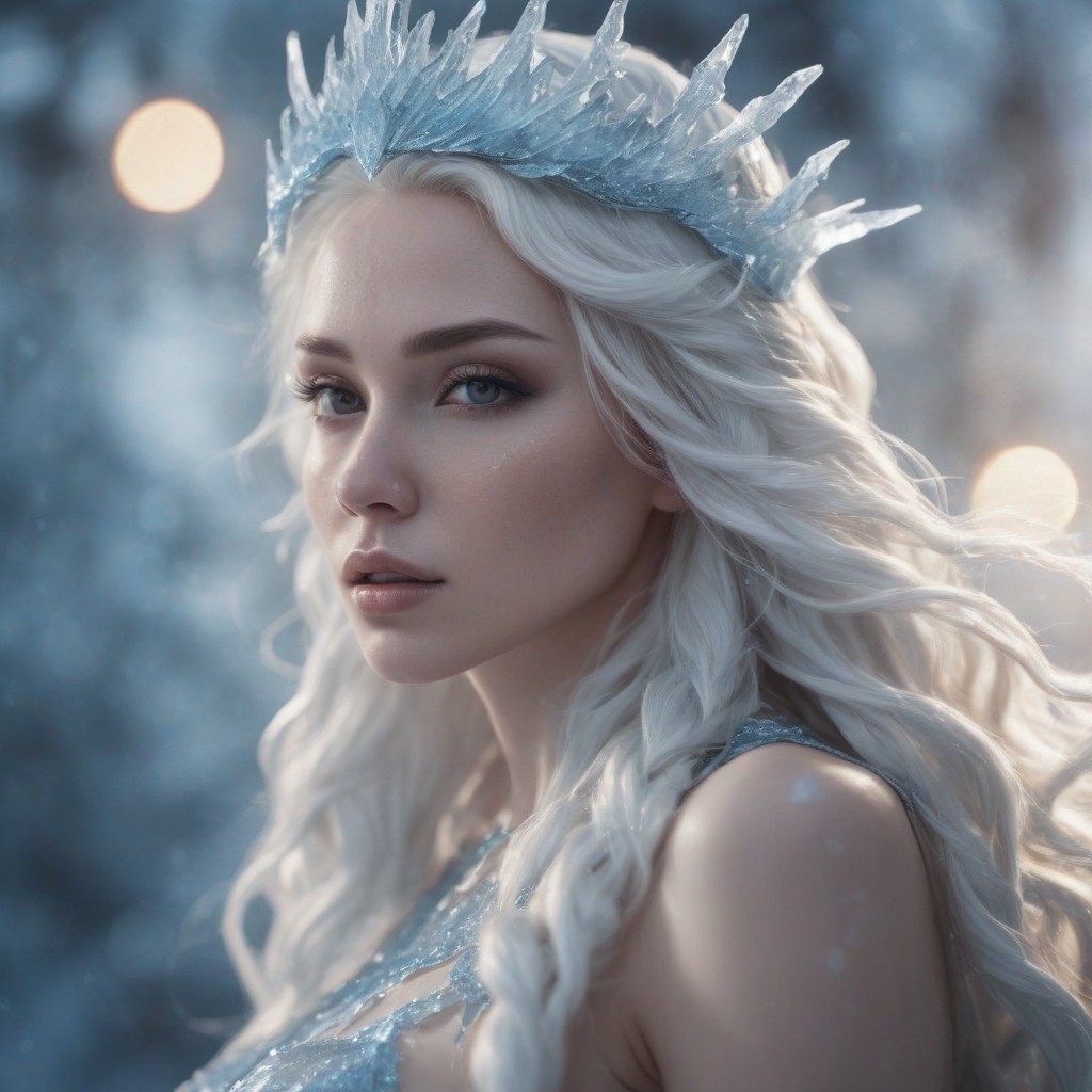 A woman with long, white hair wears an intricate ice crown and gazes off into the distance, standing in a mystical forest.