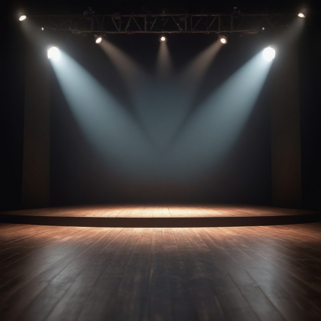 A dark stage with spotlights illuminating a wooden platform, creating a sense of anticipation.