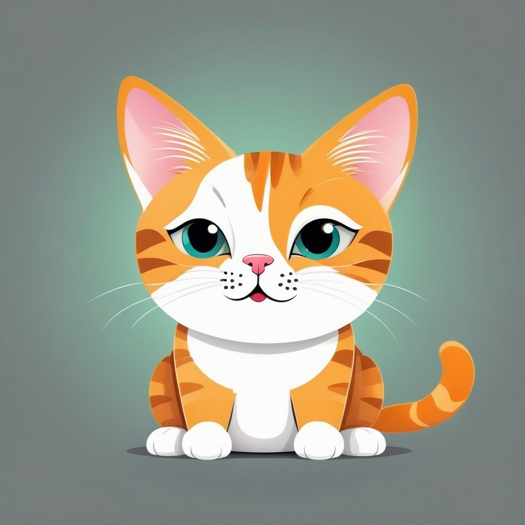 A cartoon orange tabby kitten with white markings sits against a gray background, smiling and looking at the viewer.