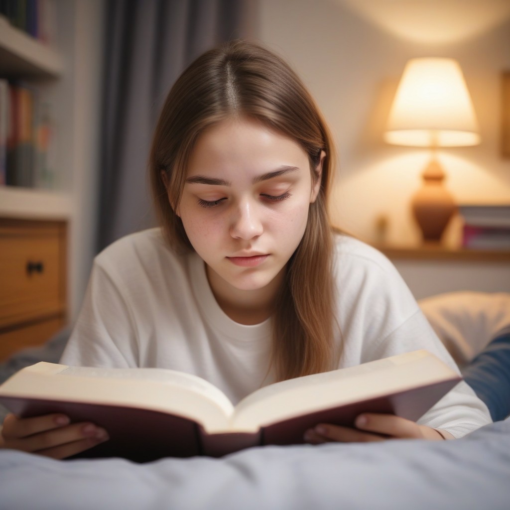 A young woman lies in bed reading a book, illuminated by a lamp.