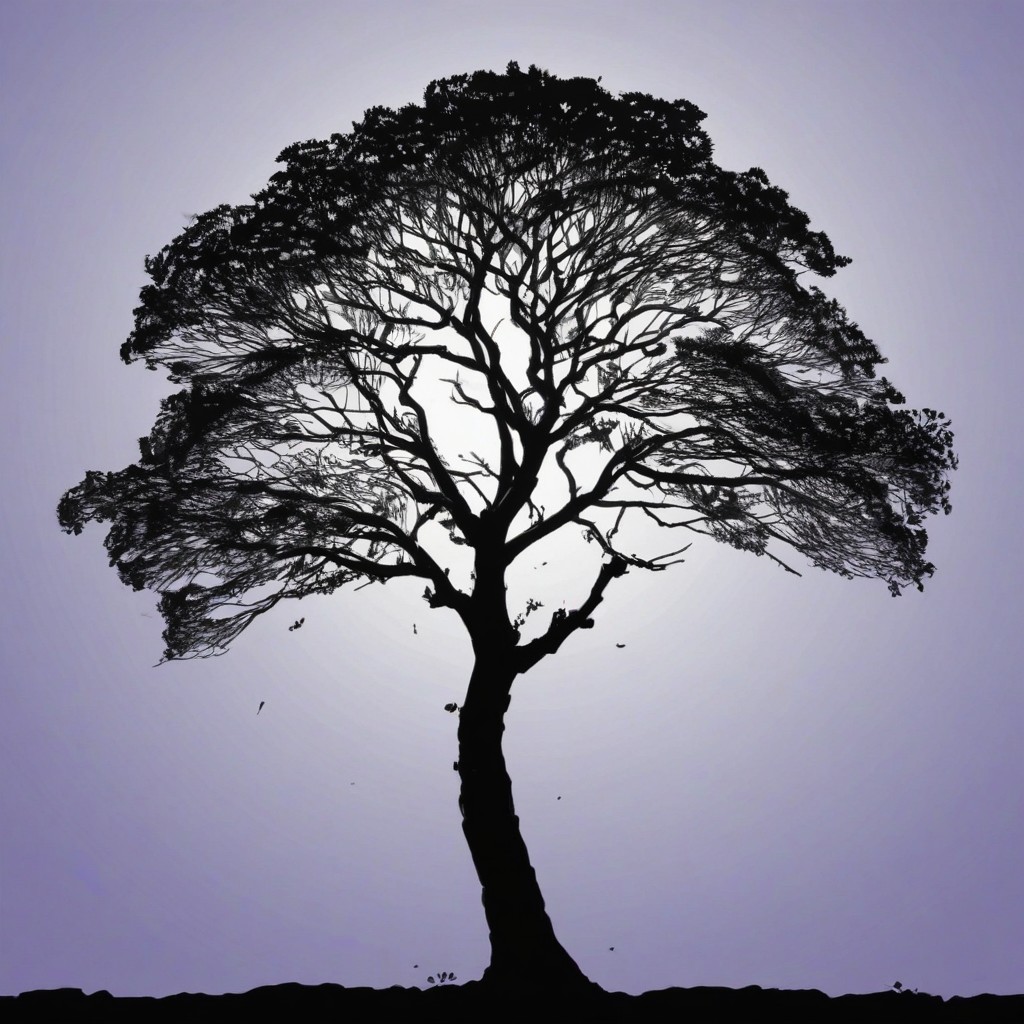 A lone tree stands tall against a purple sky, its branches reaching out as leaves scatter in the wind.