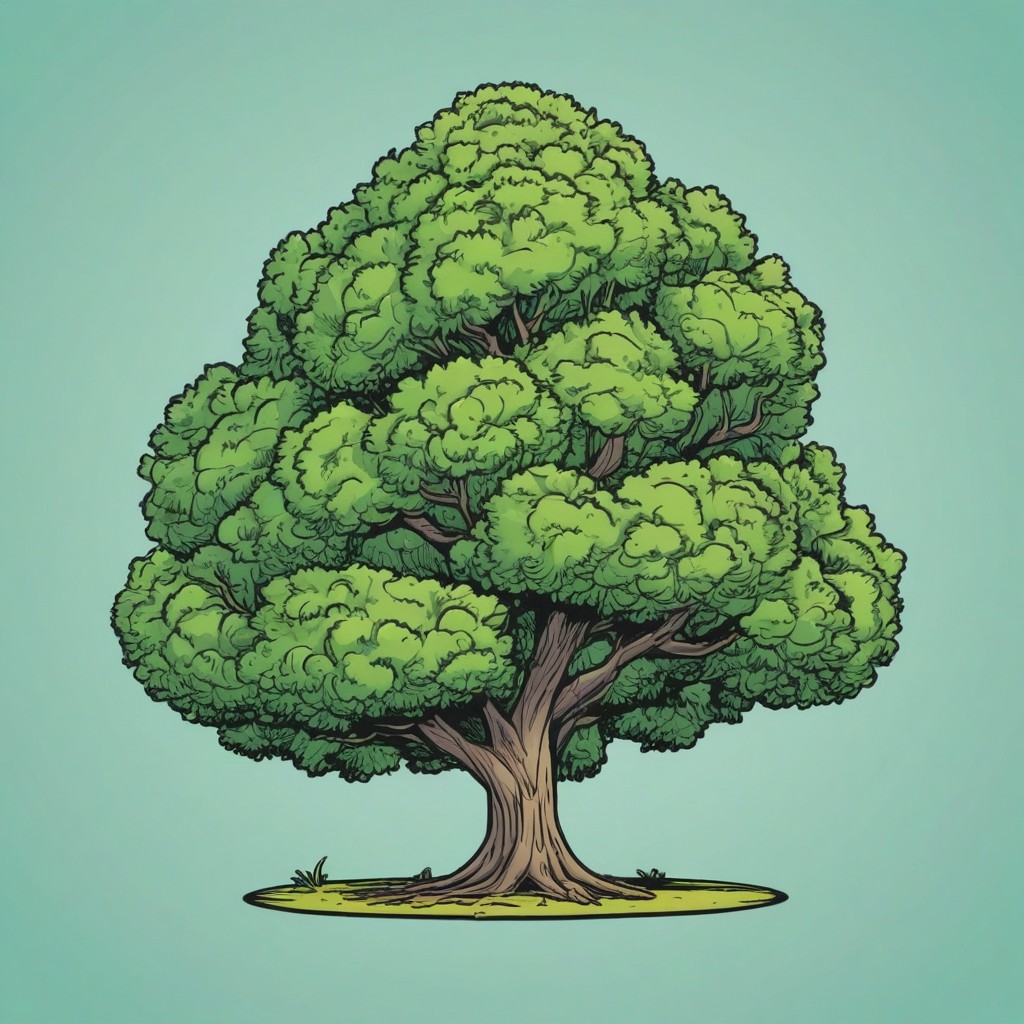 A detailed illustration of a large green tree with a thick trunk and many branches.