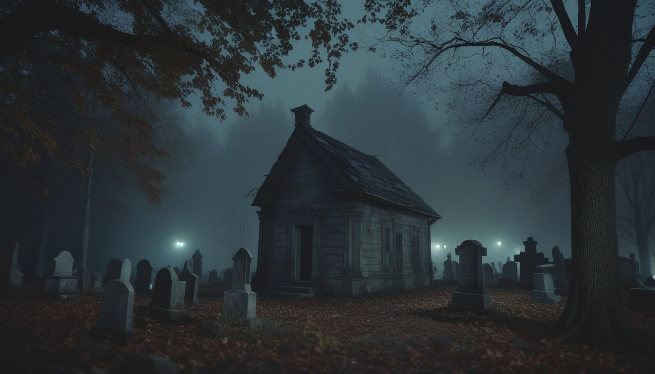 A small chapel stands in a foggy graveyard at night, surrounded by headstones and lit by dim lamps.
