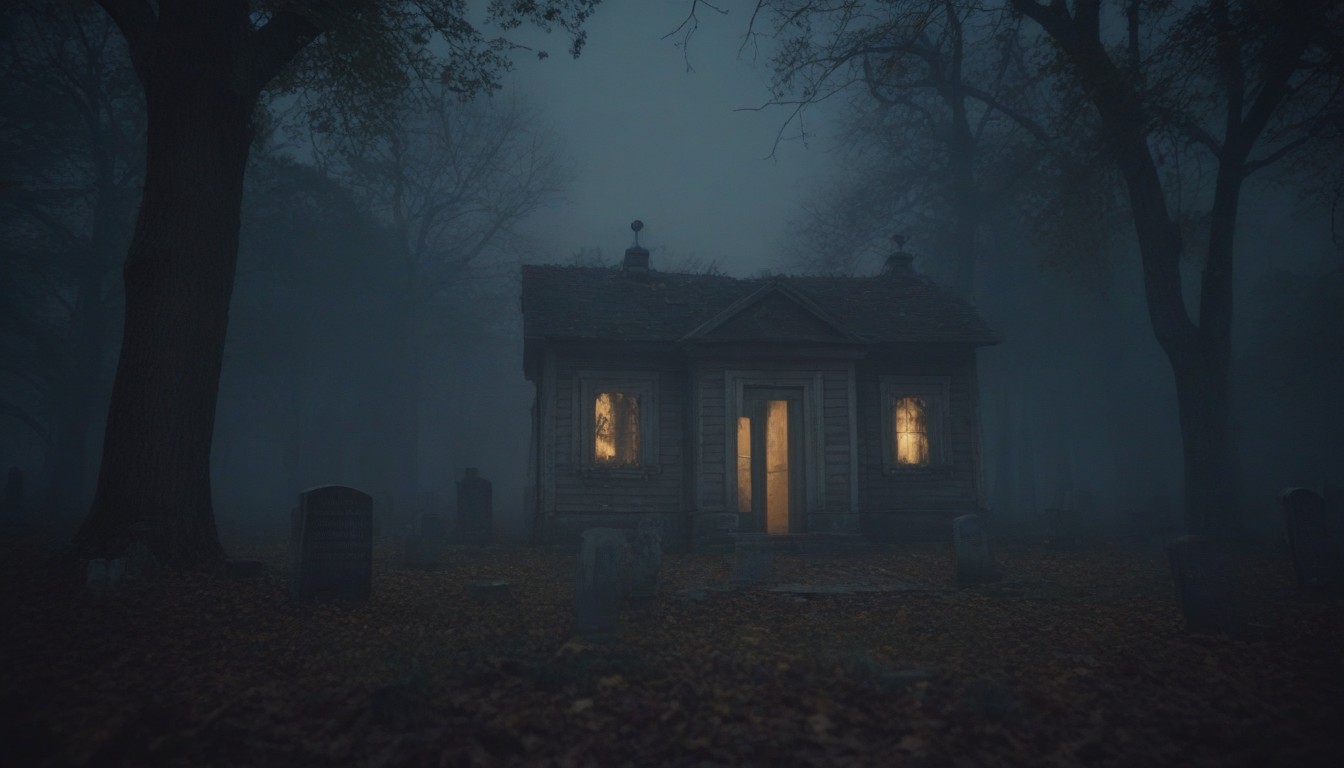Wooden building in rural cemetery with illuminated cross and eerie foggy atmosphere.