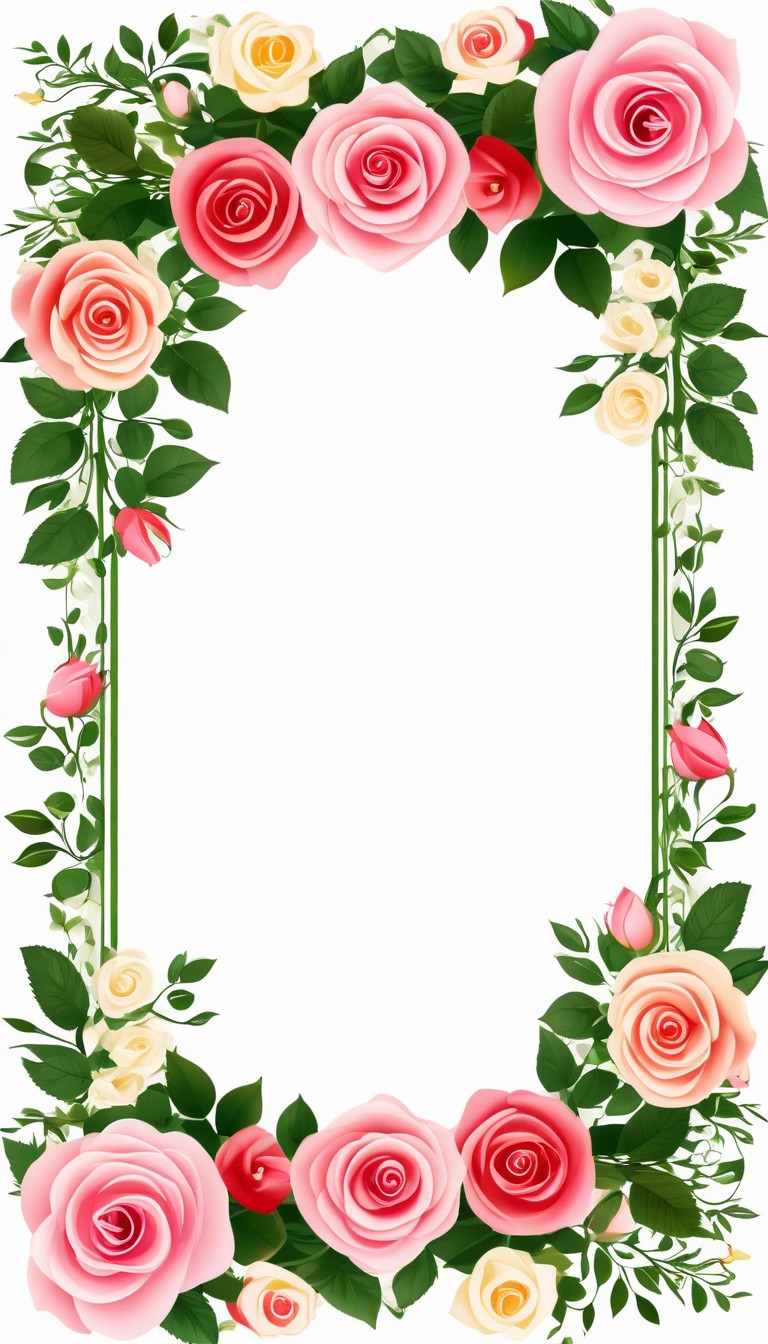 Pink and cream roses with green leaves form a vertical border around a white space.