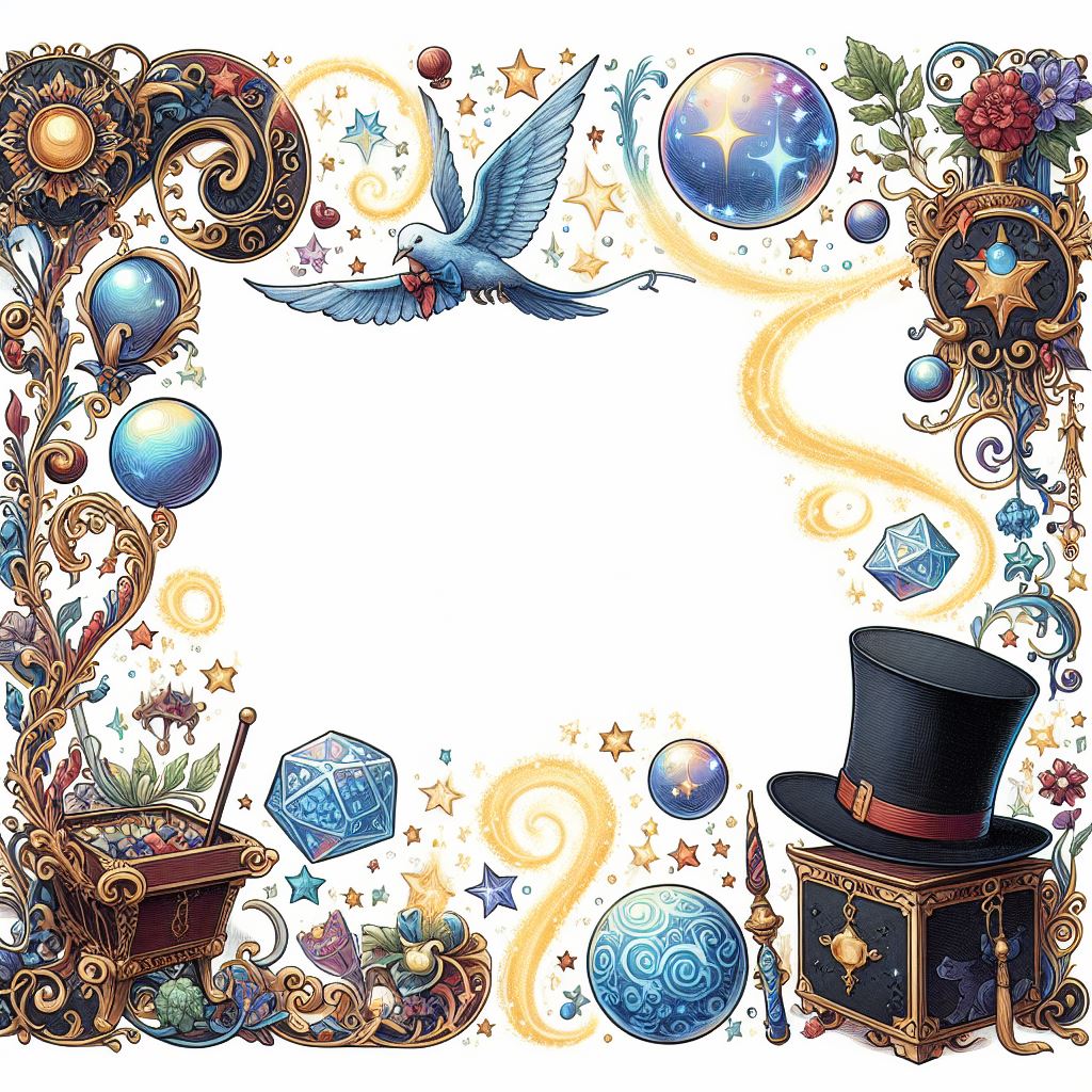 A white background with gold and blue embellishments. The top left corner features a flying bird and the bottom right corner has a top hat.