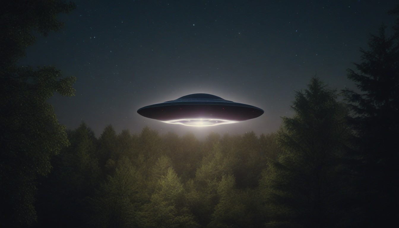 A glowing UFO hovers above a dense forest of pine trees at night. The craft emits a bright light from its underside, illuminating the surrounding trees. Stars are visible in the dark sky.