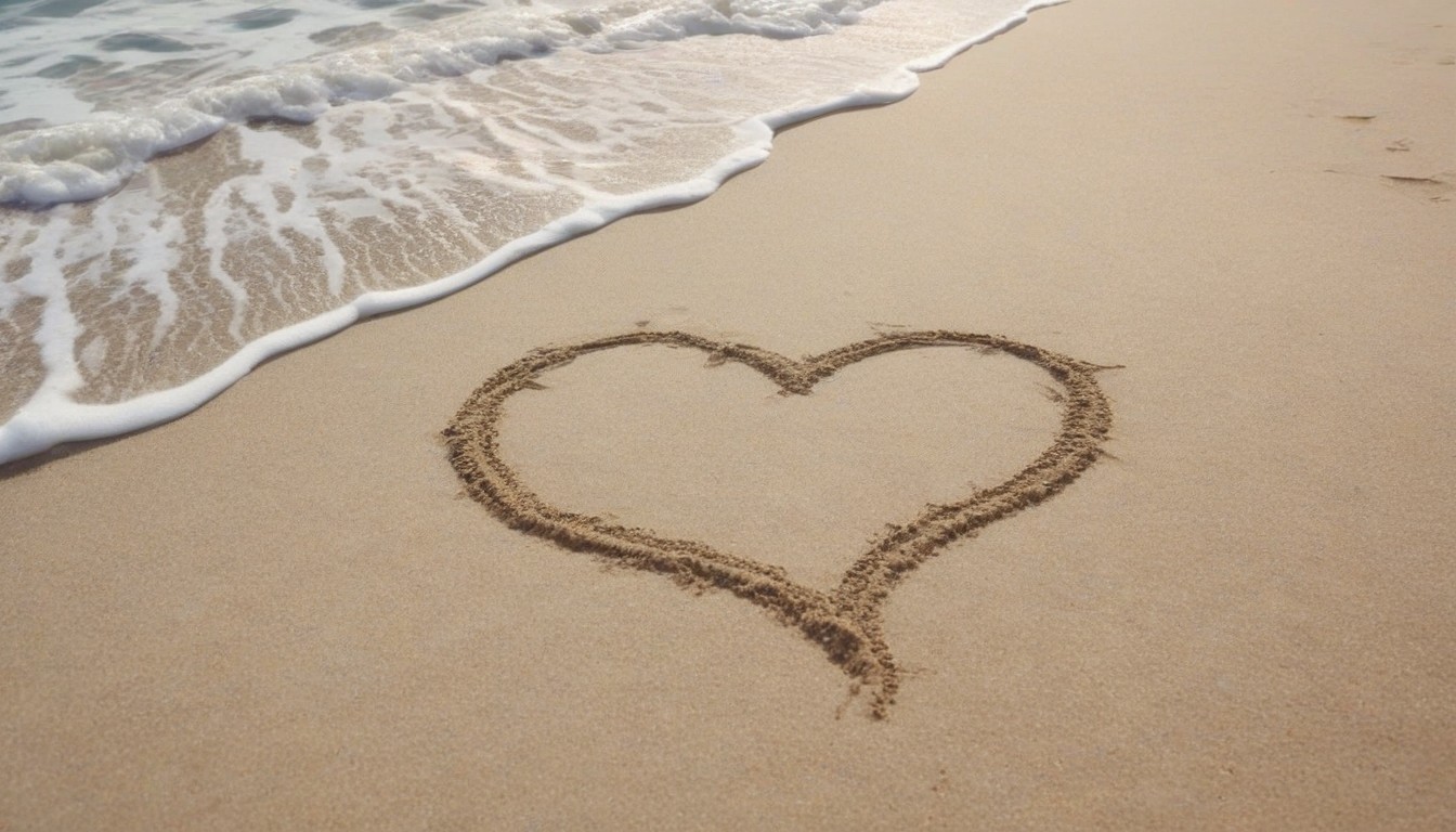 A heart drawn in the sand on a beach with a wave in the background.