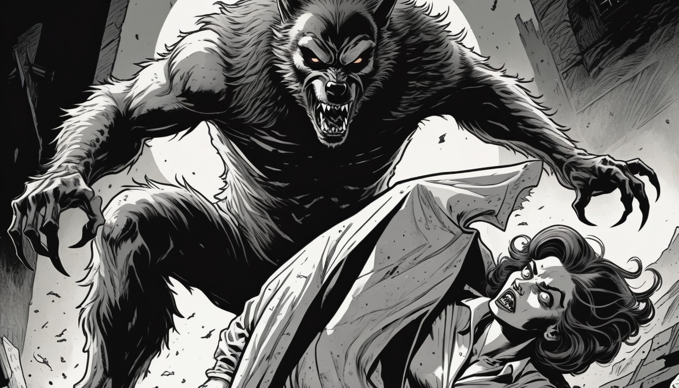A werewolf attacks a woman in a city, claws out. Woman gazes up in fear, buildings and debris in background.