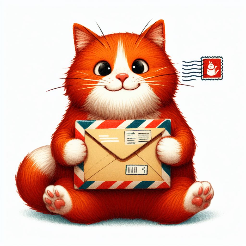 A red cat with a white chest and paws sits and holds a brown envelope with a red, white, and blue border.