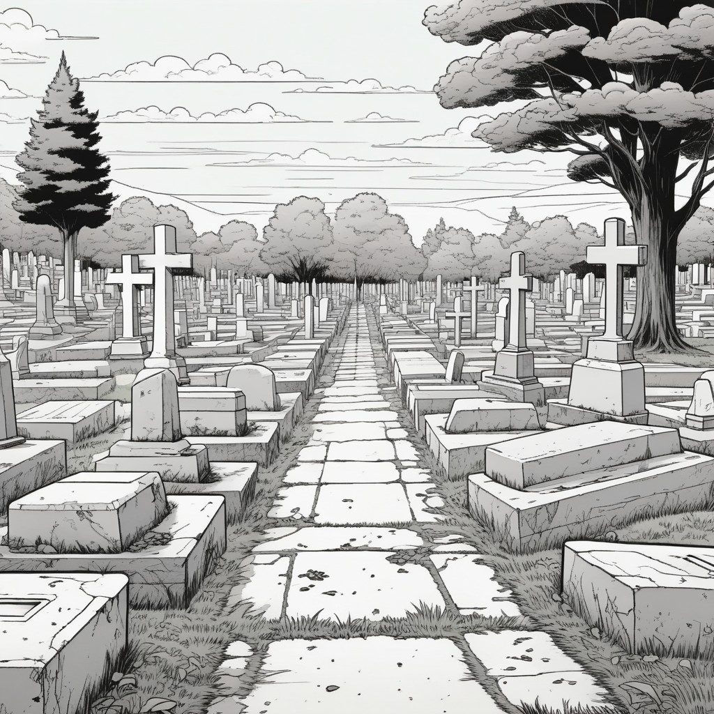 A stone path leads through a graveyard filled with headstones and crosses, with a large tree in the background.