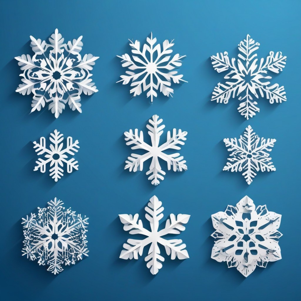 Nine intricately designed white paper snowflakes are arranged in rows on a blue background.