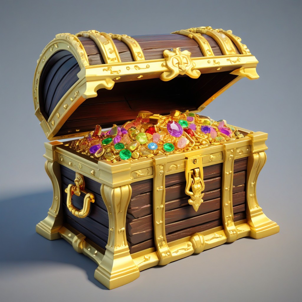 A wooden treasure chest with ornate gold accents is open, revealing a pile of gold coins and precious gemstones.