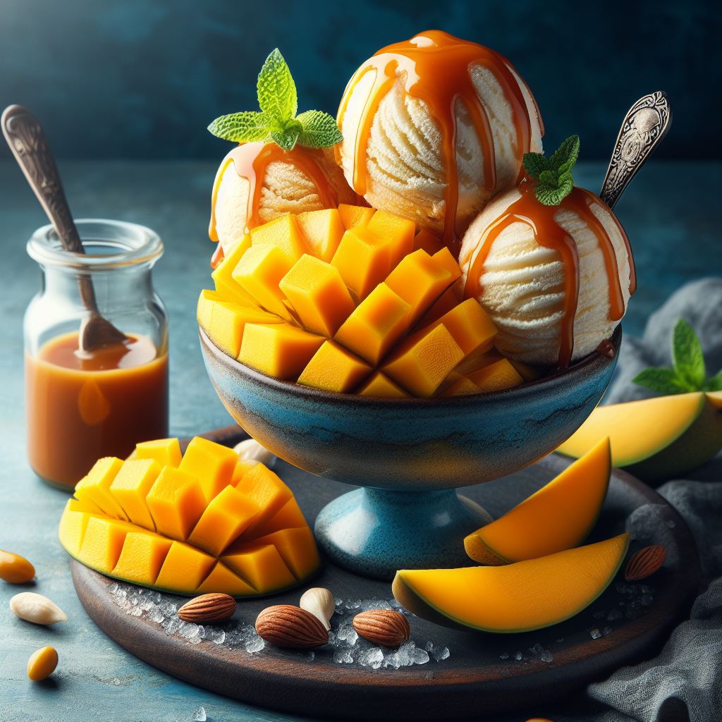 caramel, cold, cream, creamy, delicious, dessert, food, fruit, ice, mango, mint, refreshing, sauce, snack, summer, sweet, tasty, topping, treat, vanilla