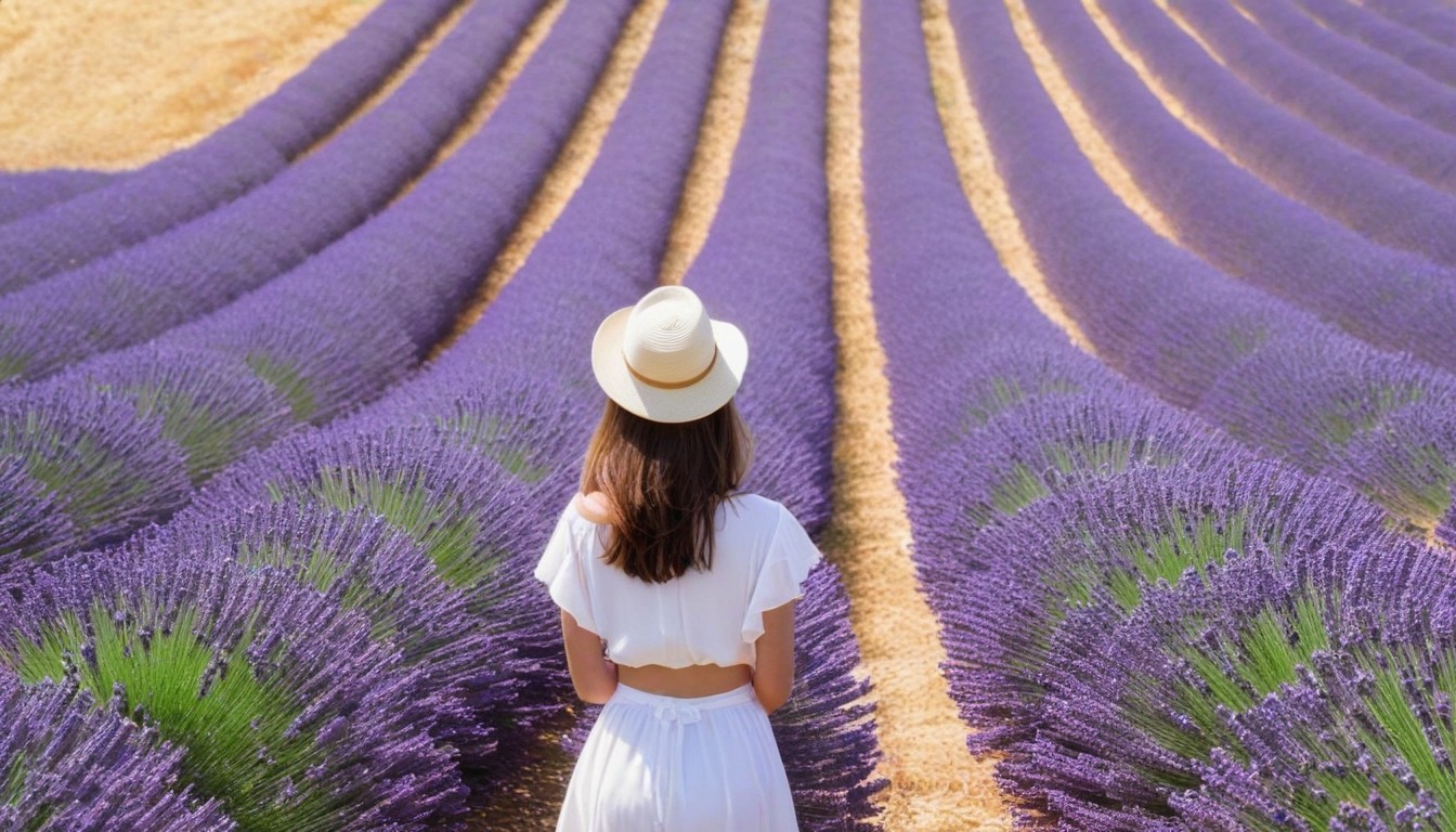 A woman in a white dress and hat walks through rows of blooming lavender.