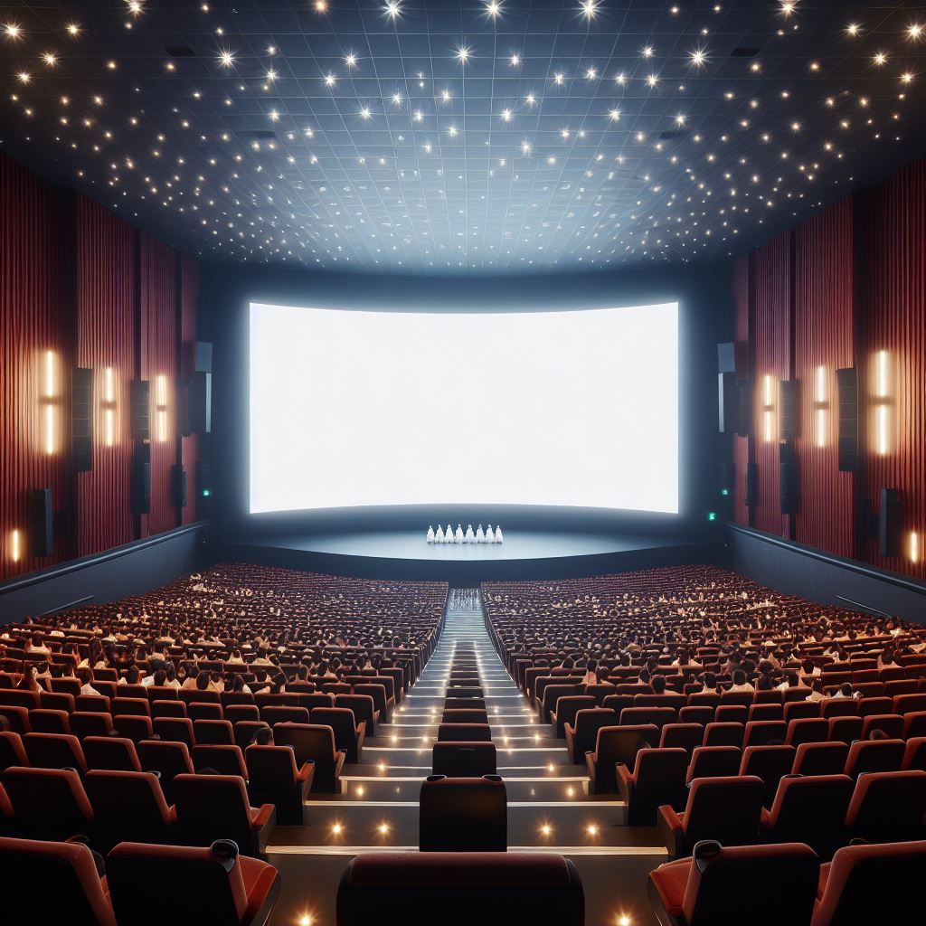 A large, modern movie theater with rows of empty seats and a blank screen. The stage is set up with microphones, ready for a show to begin.