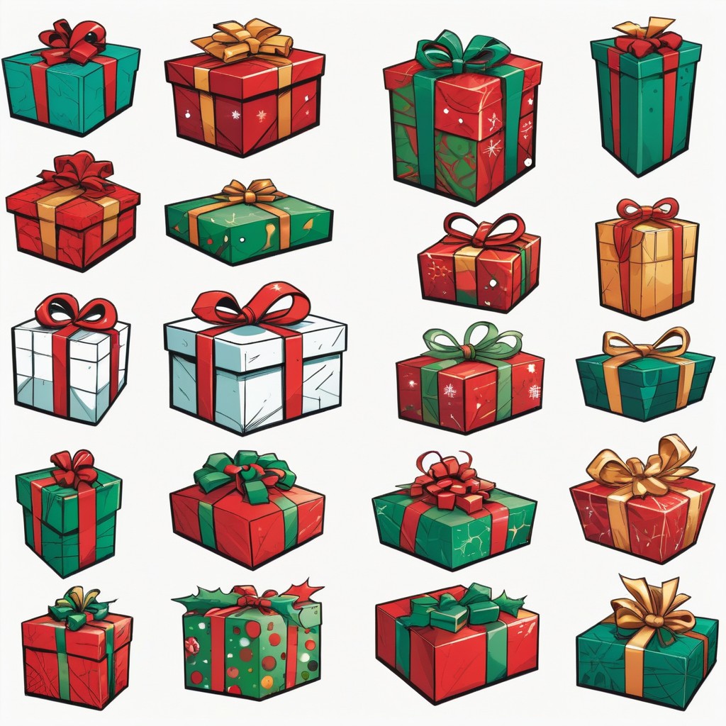 A collection of 18 cartoon gift boxes in various colors and designs.