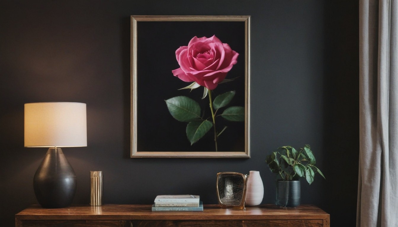 A single, pink rose is displayed in a gold frame on a dark wall, with a lamp, books, and plant on a wooden table in the foreground.