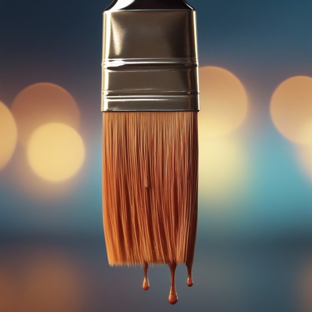 A paintbrush with brown paint dripping from the bristles against a blurred background of lights.