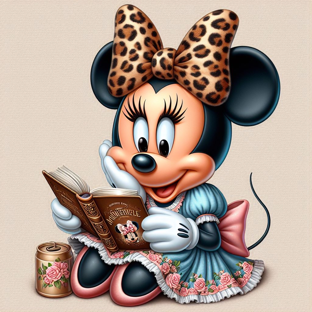 Minnie Mouse, wearing a blue dress and leopard-print bow, sits and reads a book.