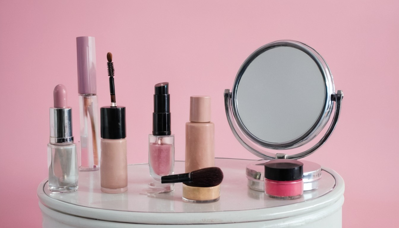 A vanity table with an assortment of makeup products, including lipstick, foundation, and a mirror, against a pink background.